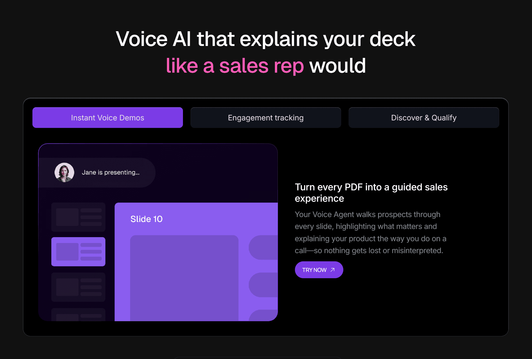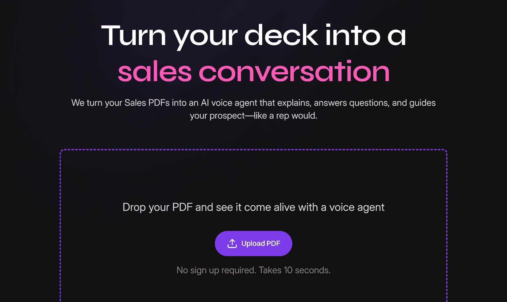 Add Voice AI to your Sales PDFs - explains your product, answers questions, and guides your prospect just like a rep would.