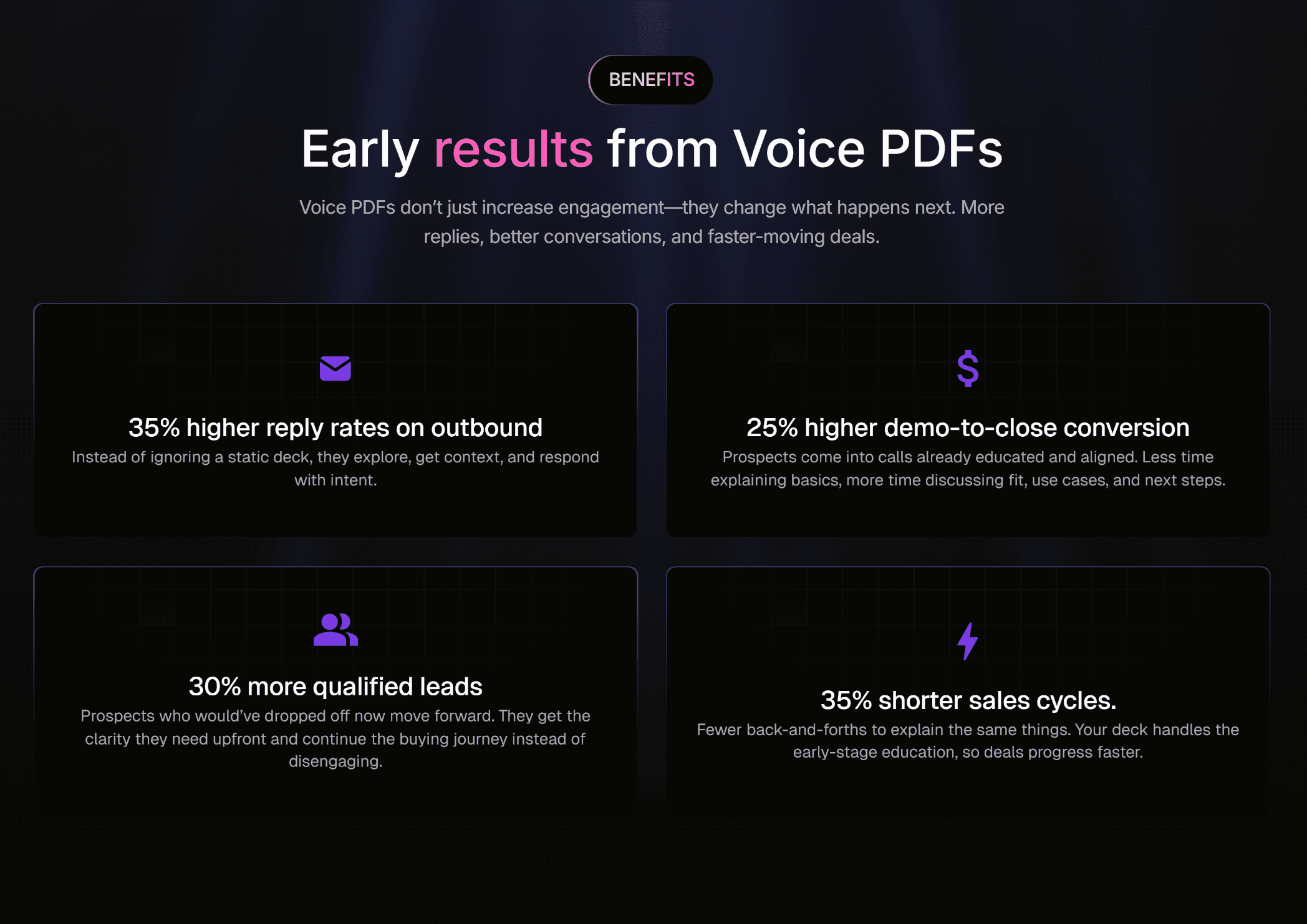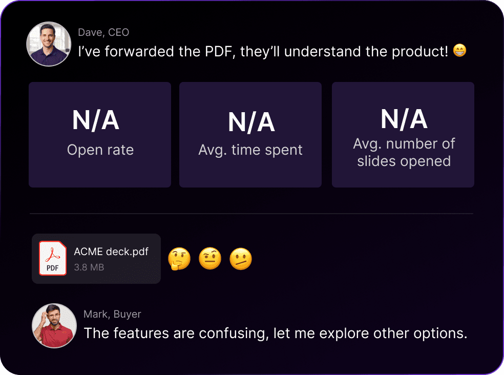 Fewer back-and-forths to explain the same things. Your deck handles the early-stage education, so deals progress faster.